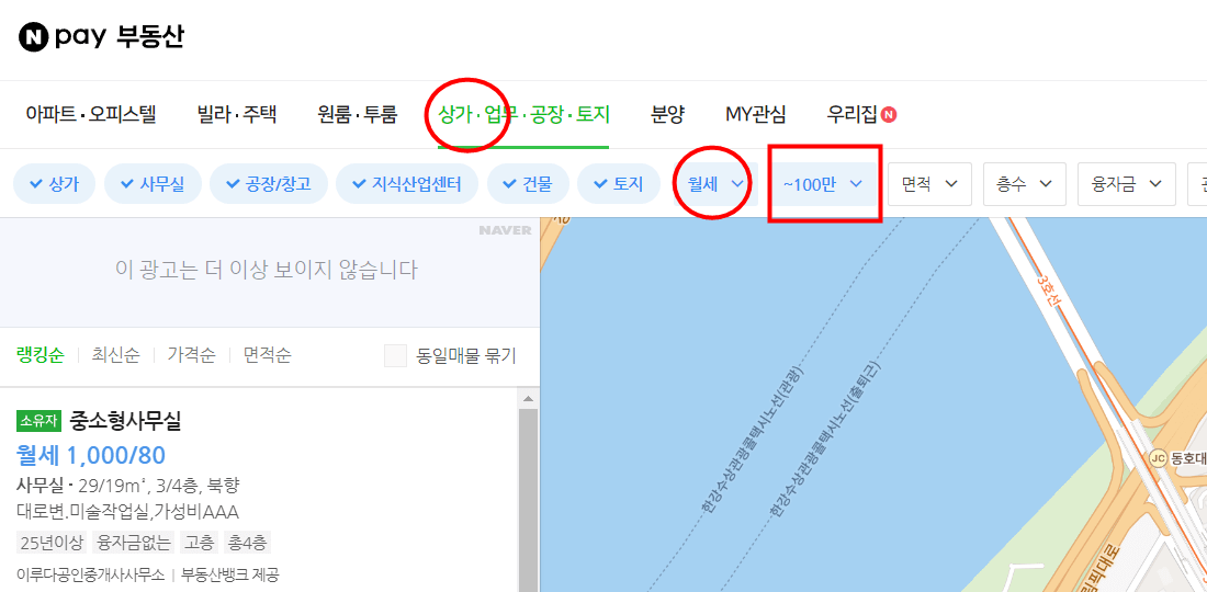 우리는 상가를 얻어야 되기 때문에 상가 --->> 월세 --->> 가격대 ... 를 입력하시면 됩니다.