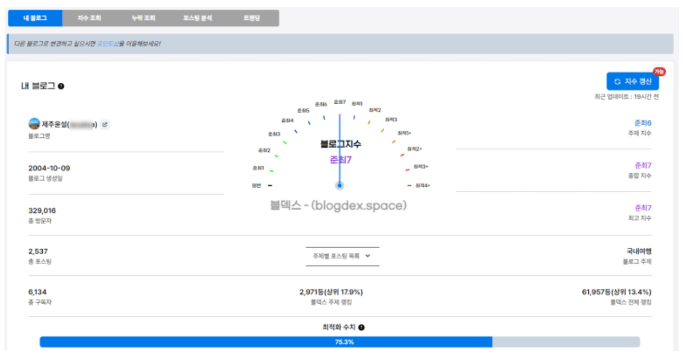 내 블로그 지수뿐만 아니라 다른 사람의 블로그 지수까지 조회가 가능하고, 각 포스팅별 지수도 체크할수 있답니다.
