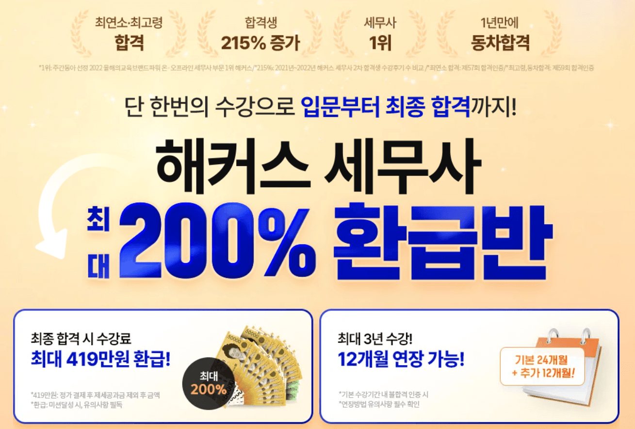 해커스 아카데미에서는 200% 환급반을 운영하고 있습니다. 최종 합격시 수강료 최대 419만원을 환급해 준다고 합니다. 최대 3년까지 수강이 가능하며 12개월 연장이 가능합니다